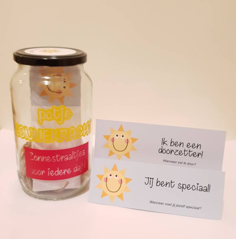 Een Potje ZONNEKRACHT als mooi cadeautje of een oppeppertje voor iemand in je omgeving die het goed kan gebruiken. Of natuurlijk een mooi cadeautje voor jezelf! Voor je (gastouder) gezin, je team, je klas of je praktijk?